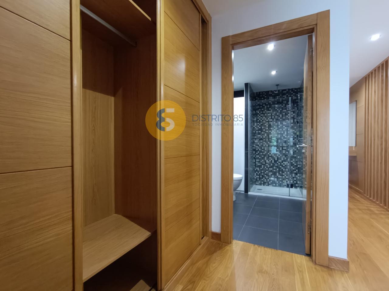 Habitación exterior con zona de vestidor y elegante baño con plato de ducha.